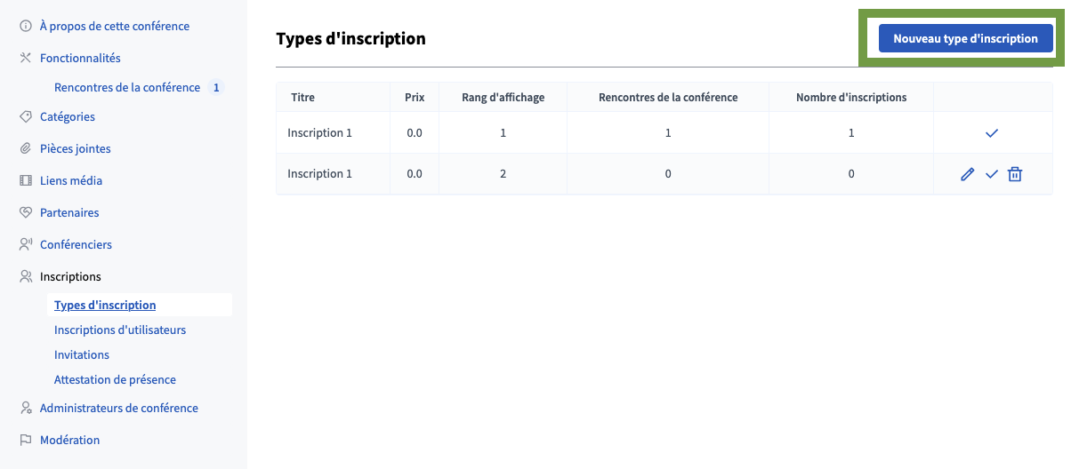 Pour que les utilisateur·ices puissent s’inscrire directement sur votre Conférence, vous devez avoir préalablement autorisé les Inscriptions dans la page d’Information de la Conférence. Il est également nécessaire de paramétrer au moins un type d’inscription avant que les utilisateur·ices ne puissent s’inscrire. Pour ce faire, rendez-vous dans l’onglet “Types d’inscription” du sous-menu de la Conférence, puis cliquez sur “Nouveau Type d'inscription”.
