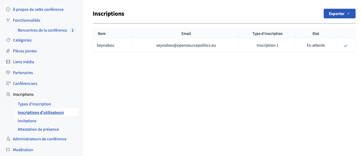 Pour avoir accès à la liste des inscrit·es, rendez-vous dans l’onglet “Inscriptions d'utilisateurs” du sous-menu de la Conférence. Après s’être inscrit·e, l’utilisateur·ice reçoit une notification lui indiquant que son inscription est en attente de confirmation. Pour confirmer l’inscription, cliquez sur “Confirmer”. Vous pouvez également exporter la liste des inscrit·es en format CSV, JSON ou EXCEL en cliquant sur “Exporter”.