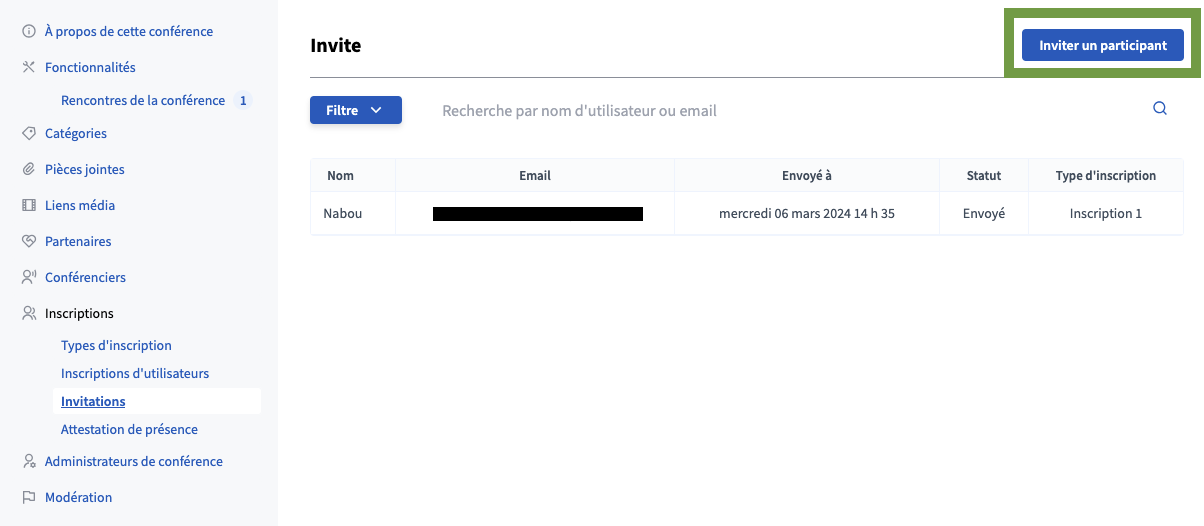 Pour inviter une personne à participer à la Conférence, rendez-vous dans l’onglet “Invitations” du sous-menu de la Conférence et cliquez sur “Inviter un participant”.