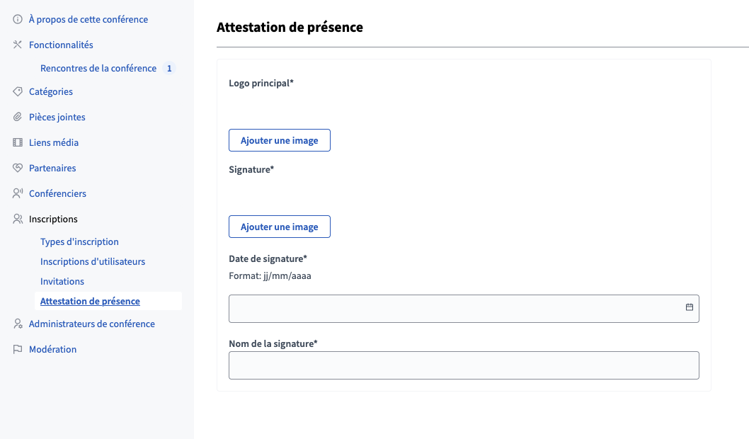 Pour créer un certificat de participation , rendez-vous dans l’onglet “Attestation de présence” du sous-menu de la Conférence. Vous pourrez alors paramétrer un certificat permettant aux participant·es d’obtenir un document attestant de leur participation à la Conférence.