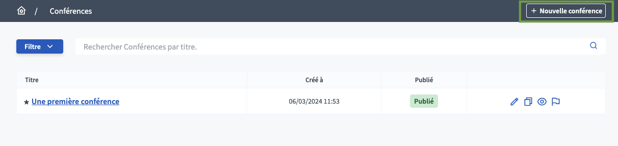 Pour créer une conférence, vous devez vous rendre dans l'onglet "Conférences". Vous accédez alors à la page de gestion des conférences. Appuyez sur "Nouvelle conférence". La fenêtre de configuration d’une conférence s’ouvre.