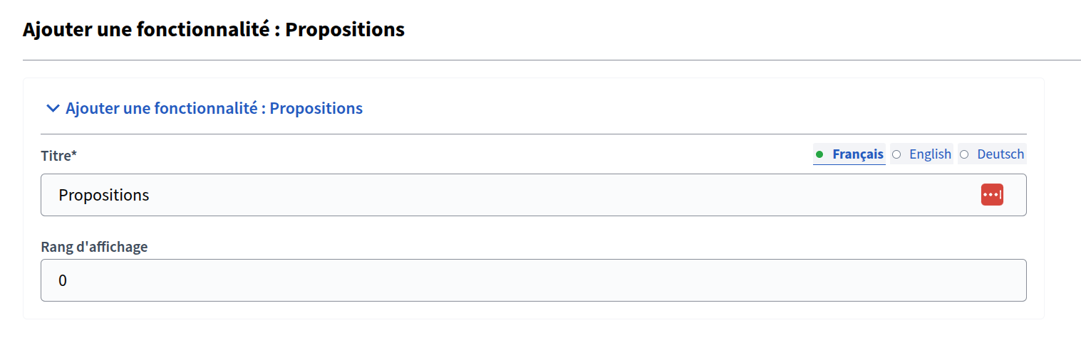 Vous devez tout d'abord entrer le Titre de votre fonctionnalité Propositions, ainsi que son Rang d'affichage. Ce paramétrage concerne le menu de votre processus (voir ci-dessous).