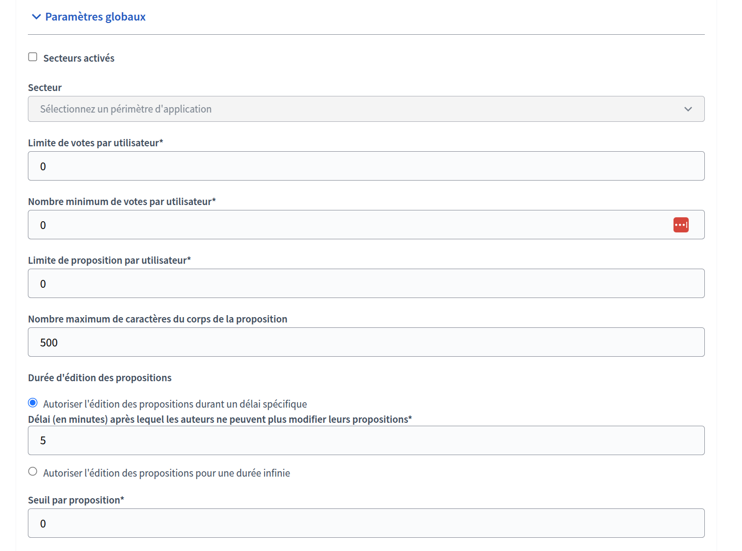 - La limite de propositions par utilisateur·ice : le nombre maximum de propositions que peuvent faire les utilisateur·ices. La valeur 0 implique un nombre de propositions illimitées.
