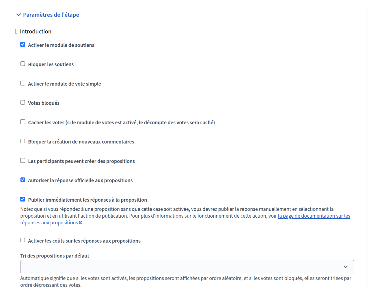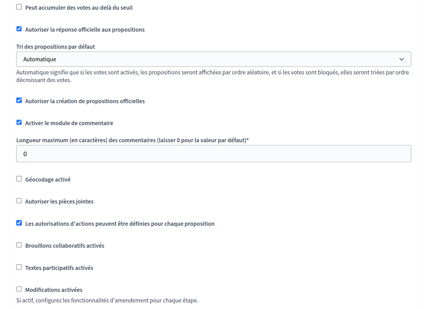 - Activer le module de commentaire : permet d'activer ou de désactiver la possibilité pour les utilisateurs de publier des commentaires sous une proposition.
