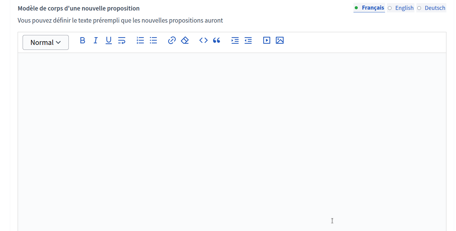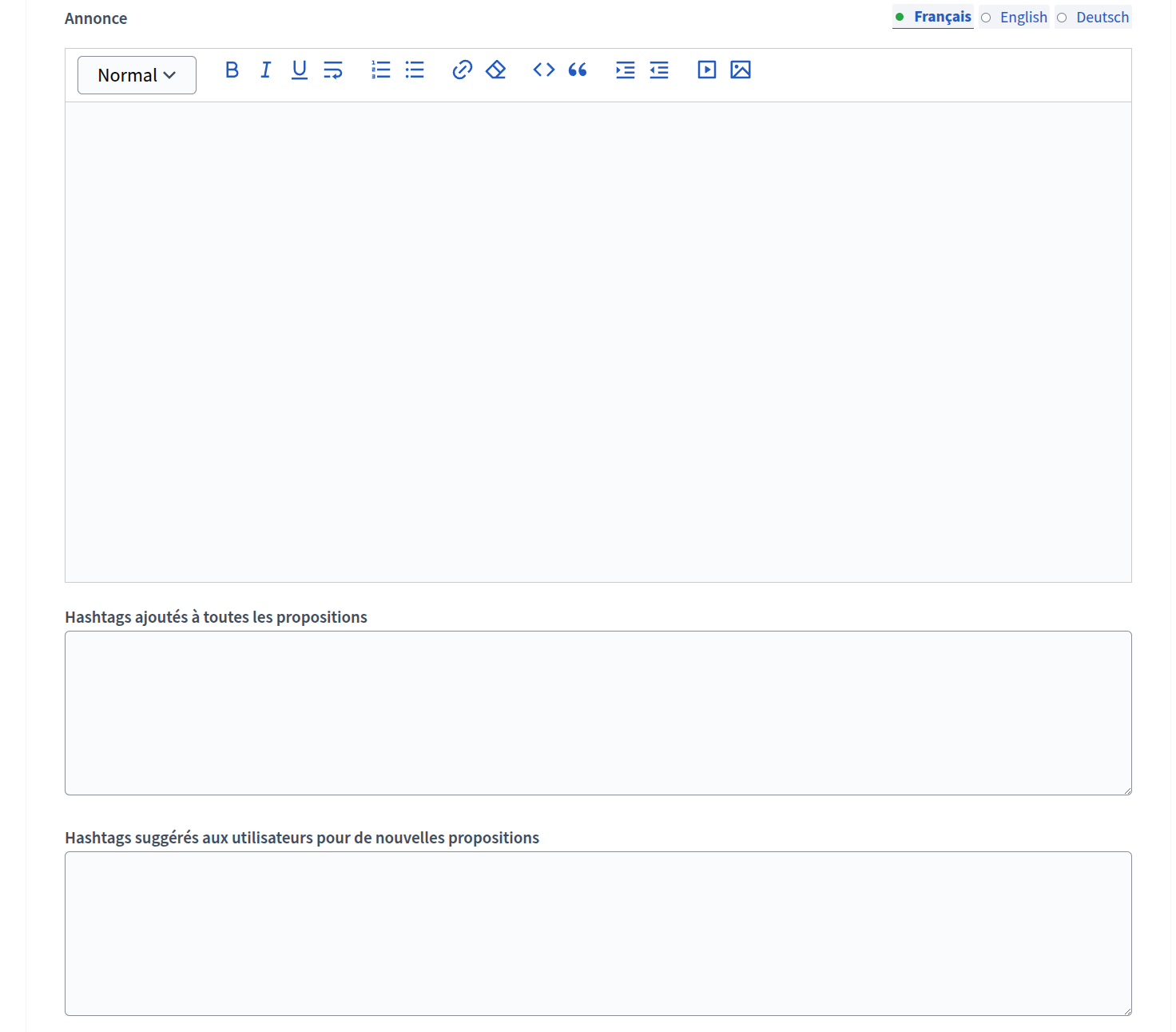 Enfin, vous pouvez paramétrer les annonces et textes d'aide pour accompagner les utilisateur·rices sur l'espace Propositions et lors de la création de propositions.
