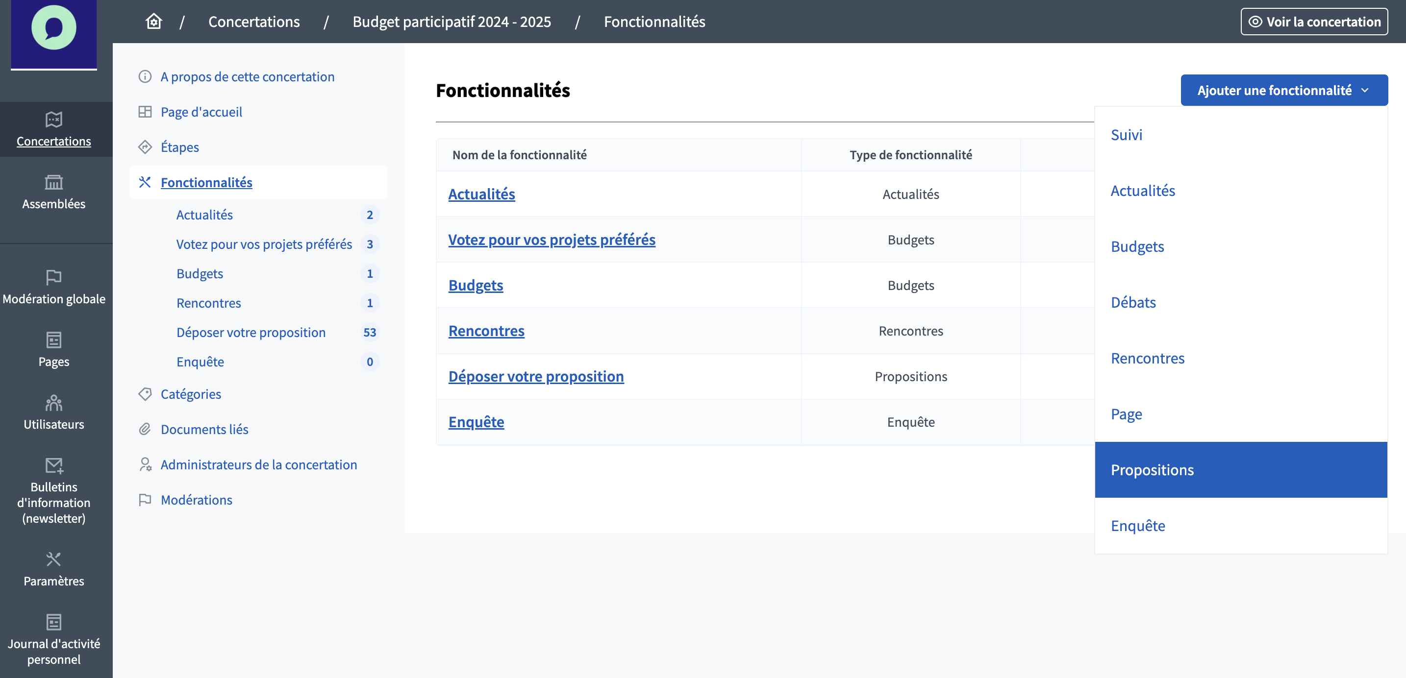 Pour configurer un module “Proposition”, vous devez vous rendre dans le sous-menu des fonctionnalités et cliquer sur “ Ajouter une fonctionnalité”. Nous vous présenterons ici la correspondance entre les éléments à renseigner dans l’écran de configuration et l'espace utilisateur.