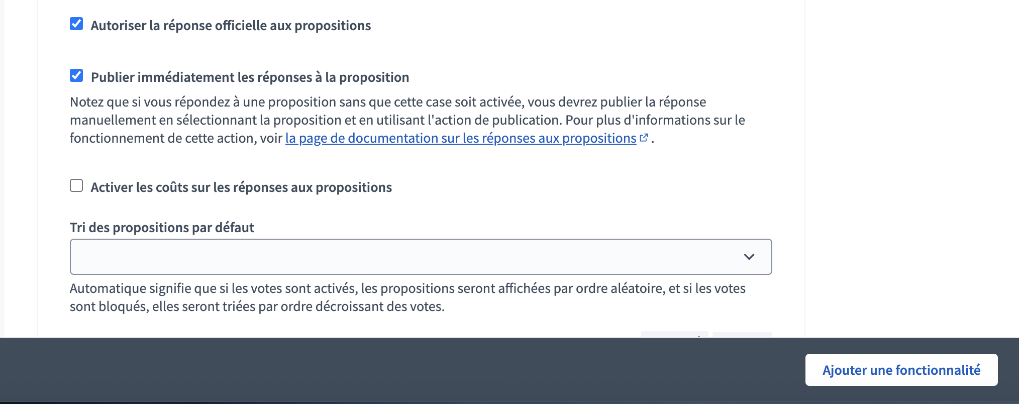 - Autoriser la réponse officielle aux propositions : vous permet de répondre aux propositions des utilisateur·ices depuis l'espace administrateur.