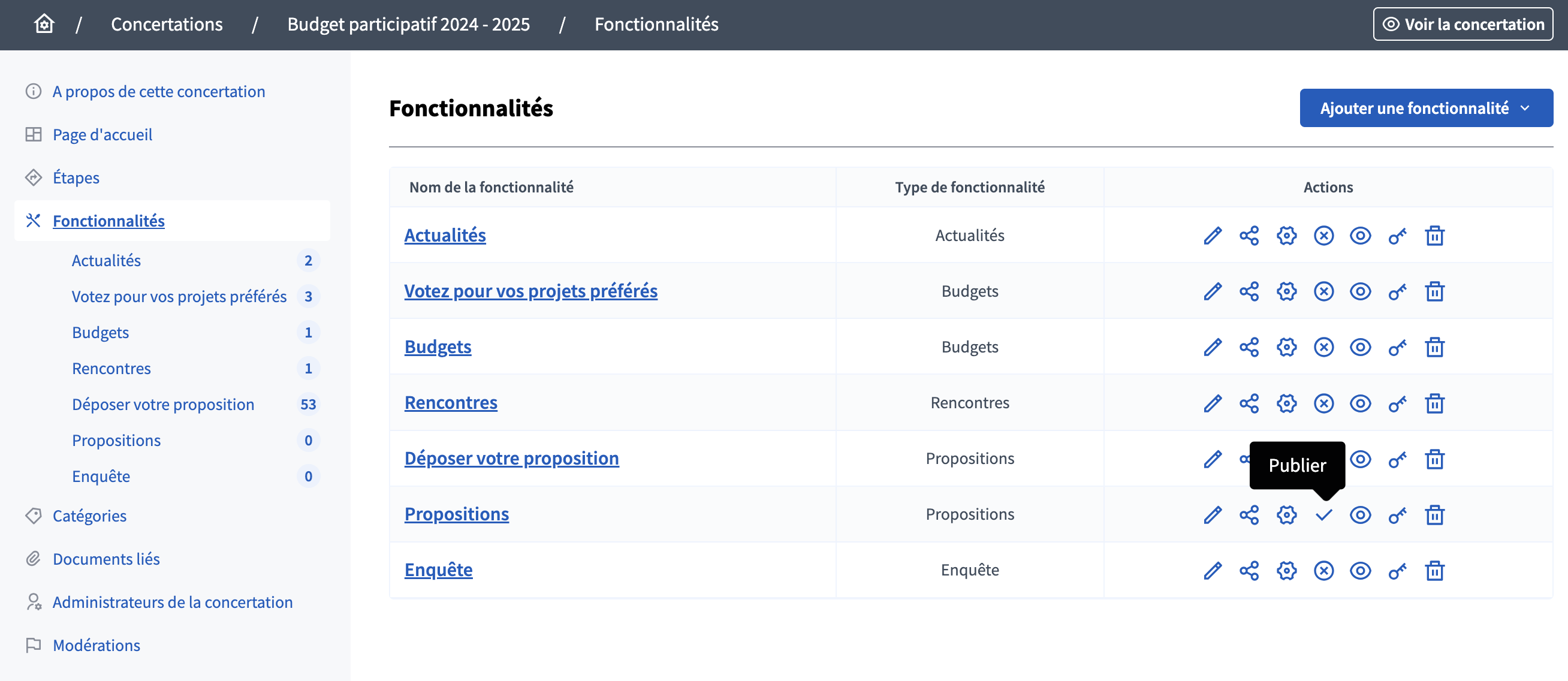 Si vous souhaitez publier votre fonctionnalité Propositions, rendez-vous dans le sous-menu Fonctionnalités de votre concertation et cliquez sur l'icône "Publier".