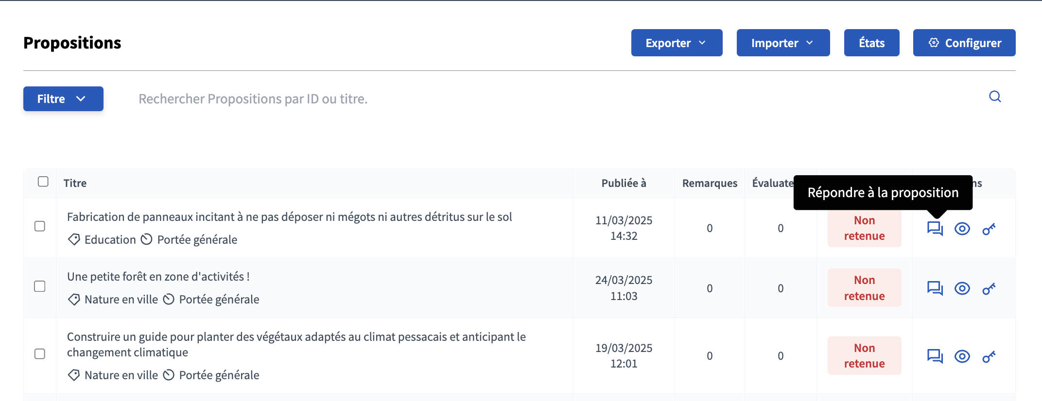 Dans la liste des propositions, cliquez sur “Répondre” pour évaluer la proposition.