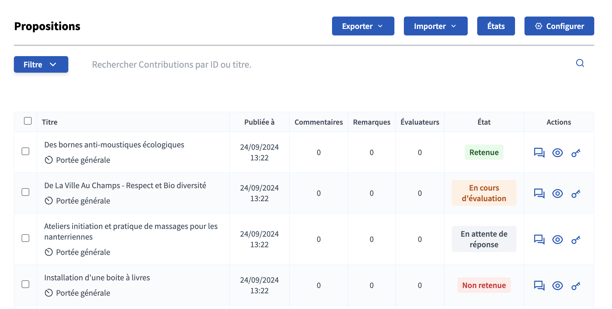 Pour que l’utilisateur·rice sache que sa contribution est prise en compte, il est important de réagir rapidement (ou lors d’une prochaine étape indiquée dès le départ). Pour évaluer des propositions, il est nécessaire d’avoir sélectionné “Autoriser les réponses officielles” dans la configuration de votre fonctionnalité Propositions.