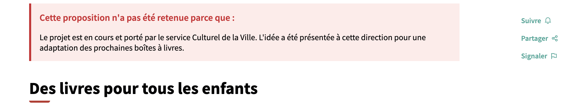 Après avoir publié une réponse officielle, l’état est mis à jour sur la plateforme et dans le back-office. Sur la page de la proposition, un encadré de la couleur correspondant à l’état attribué renseigne le porteur de la proposition sur l’étape suivante en cas d’acceptation, sur les éléments à compléter en commentaire en cas de poursuite de l’évaluation ou sur les critères de rejet.