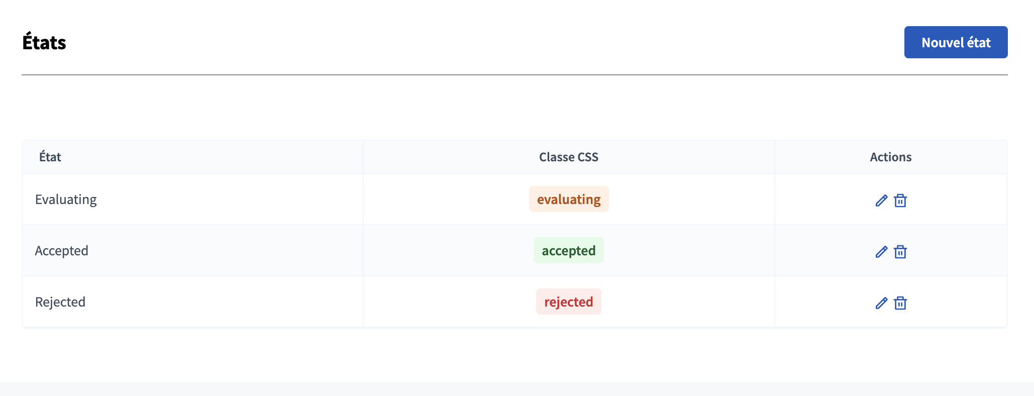 Par défaut il existe il existe 4 états : “En attente de réponse” par défaut avant réponse (bleu), “En cours d’évaluation” s’il vous manque des éléments pour statuer (jaune), “Retenue” (vert), et “Non retenue” (rouge).