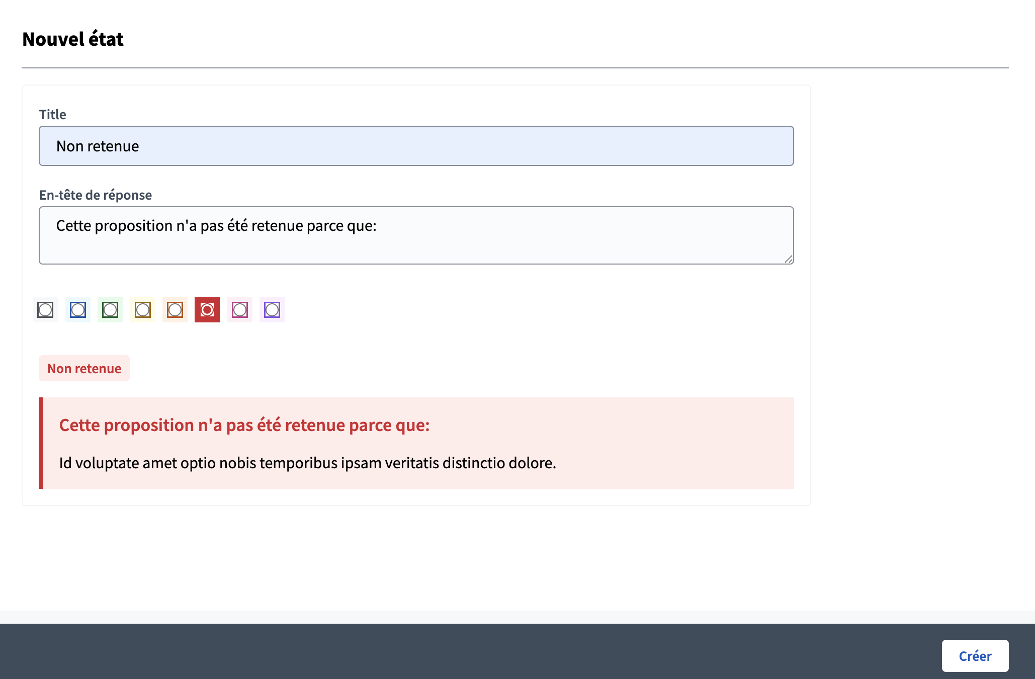 Un aperçu de la zone de réponse et de la balise s'affiche au bas du formulaire. Vous pouvez choisir le titre, la description et la couleur associée à l'état. A la fin cliquer sur "Créer" pour sauvegarder l'état.