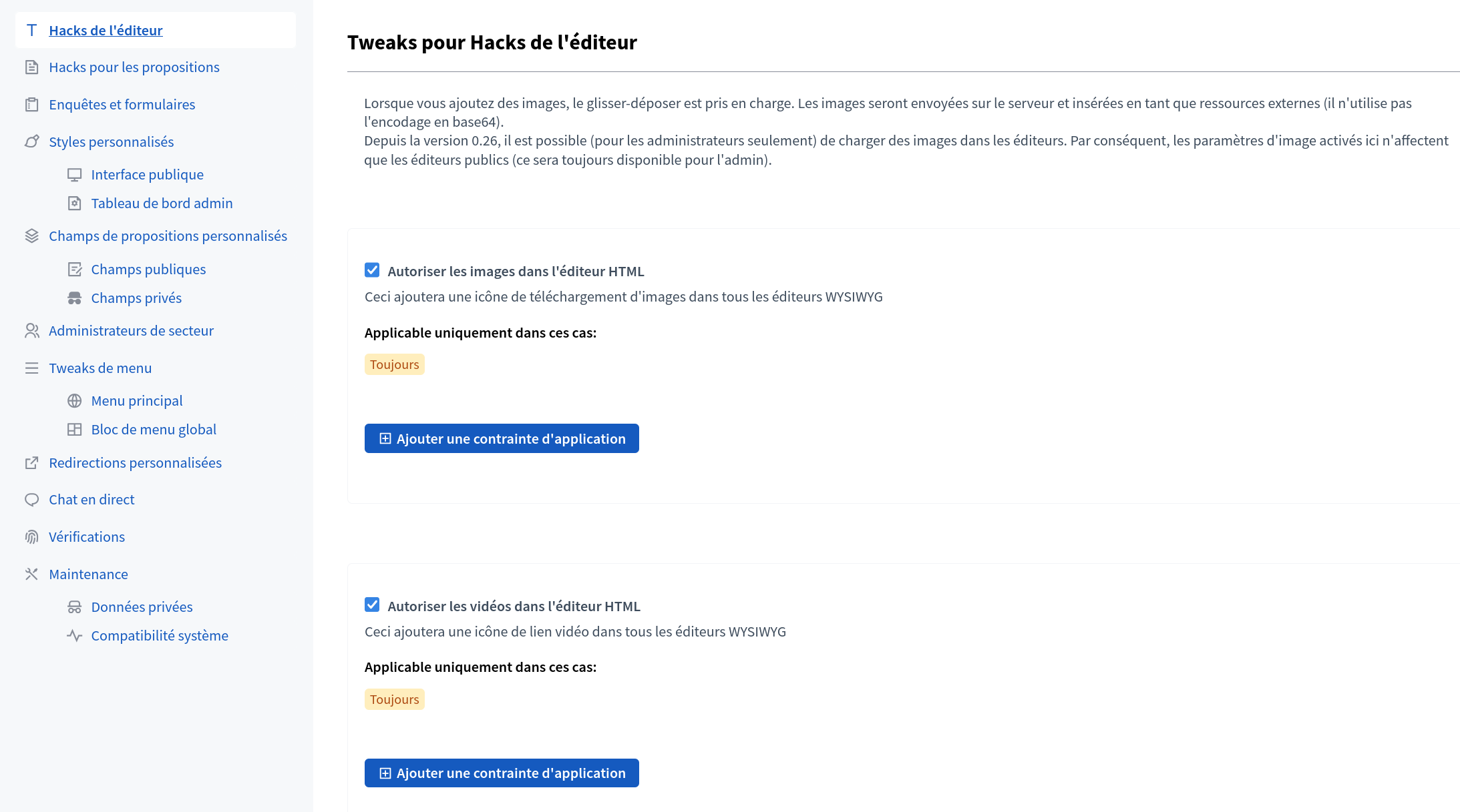 Cette fonctionnalité est très intéressante lorsque vous souhaitez autoriser l’insertion des images dans l’éditeur de proposition pour les administrateur·ices, voire même pour les utilisateur·ices !