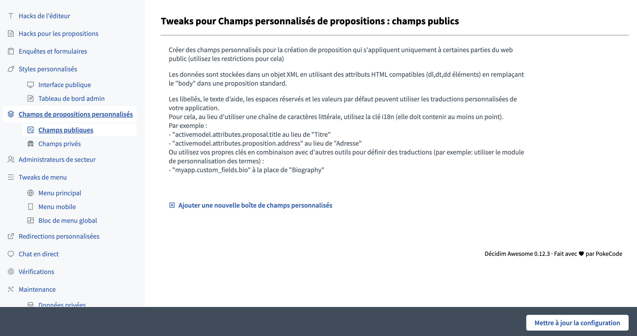 Avec le module Decidim Awesome, il est désormais possible de personnaliser le formulaire de dépôt de proposition. Pour le configurer rendez-vous dans le tableau de bord des administrateurs puis dans Decidim Awesome et cliquez sur "Champs de propositions personnalisés. "