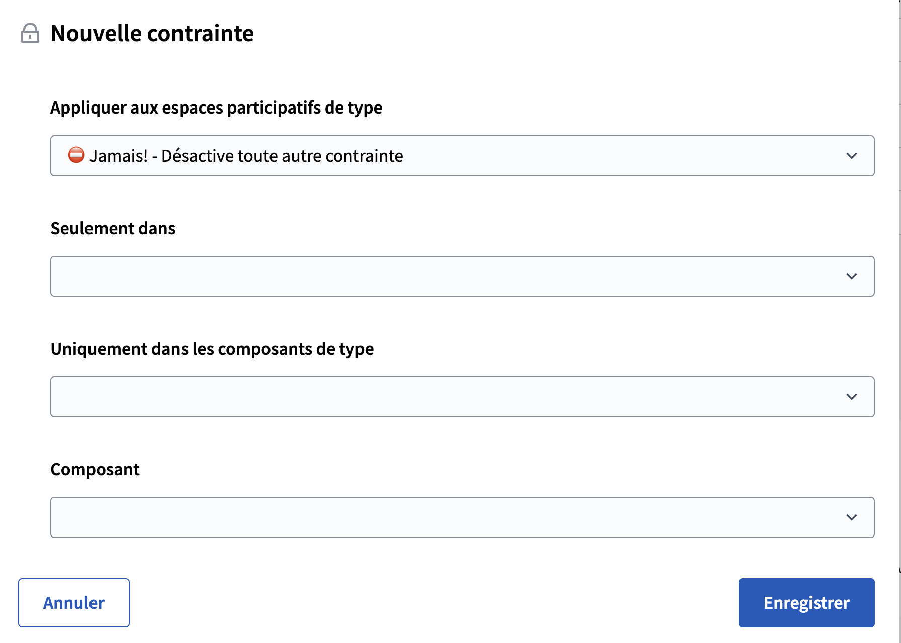 - Seulement dans : En fonction de ce que vous avez choisi comme espace participatif, vous avez la liste de vos démarches si vous voulez l'appliquer seulement dans une démarche spécifique.