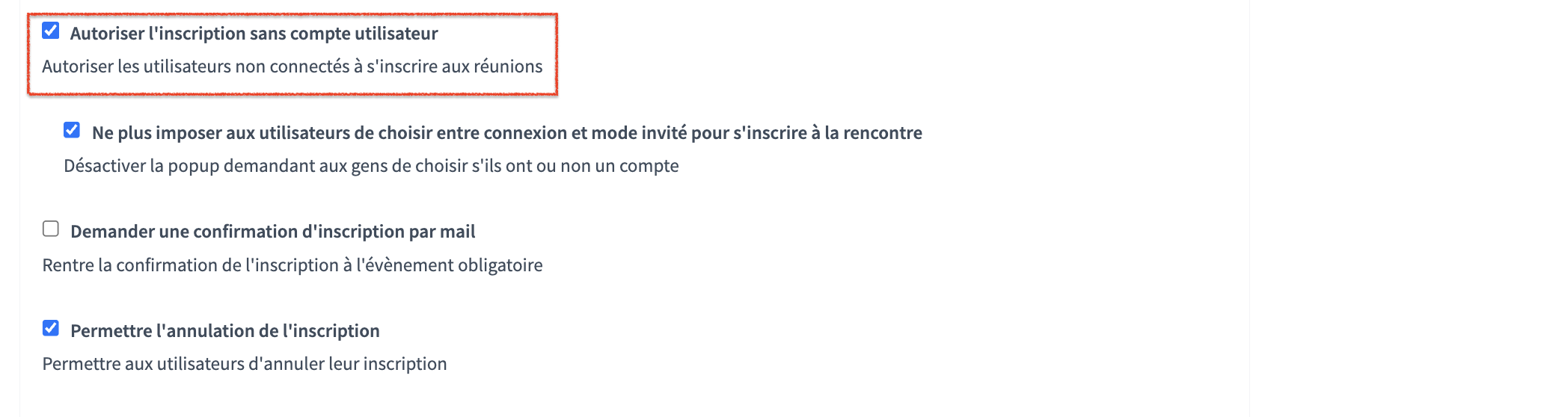 Il est possible pour les utilisateur·ices de s'inscrire à des rencontres sur la plateforme sans avoir à se créer un compte. Cette fonctionnalité vise à réduire les barrières à la participation tout en collectant les informations essentielles des participant·es (nom et adresse e-mail).