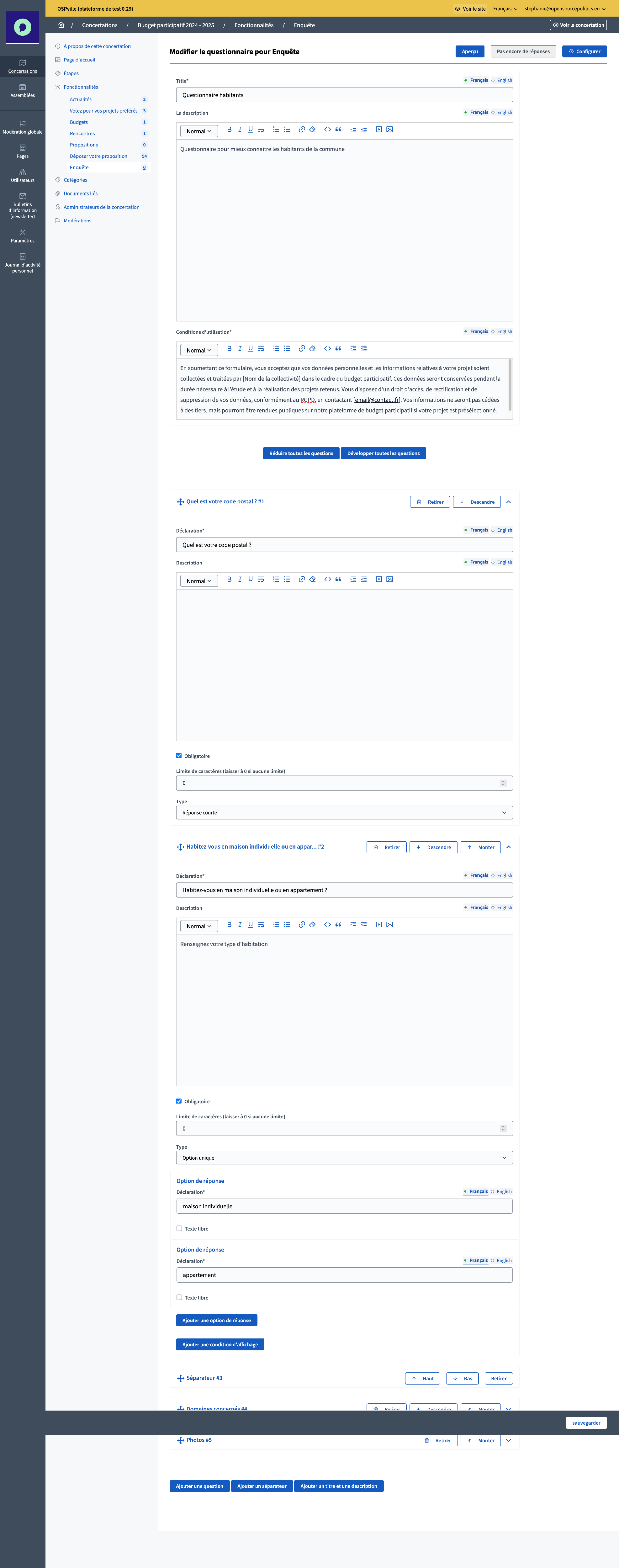 Tout d'abord, renseignez le Titre, la description et les Conditions d'utilisation de l'enquĂȘte (informations sur le traitement des donnĂ©es de l'enquĂȘte, etc.). De cette fenĂȘtre, vous pouvez Ă©galement exporter les rĂ©sultats de l'enquĂȘte aux formats CSV, JSON ou EXCEL en cliquant sur "Exporter". Ensuite, appuyez sur "Ajouter une question". Plusieurs types de questions sont accessibles. Vous pouvez dĂ©finir pour chaque question sâil est obligatoire dây rĂ©pondre ou non.
