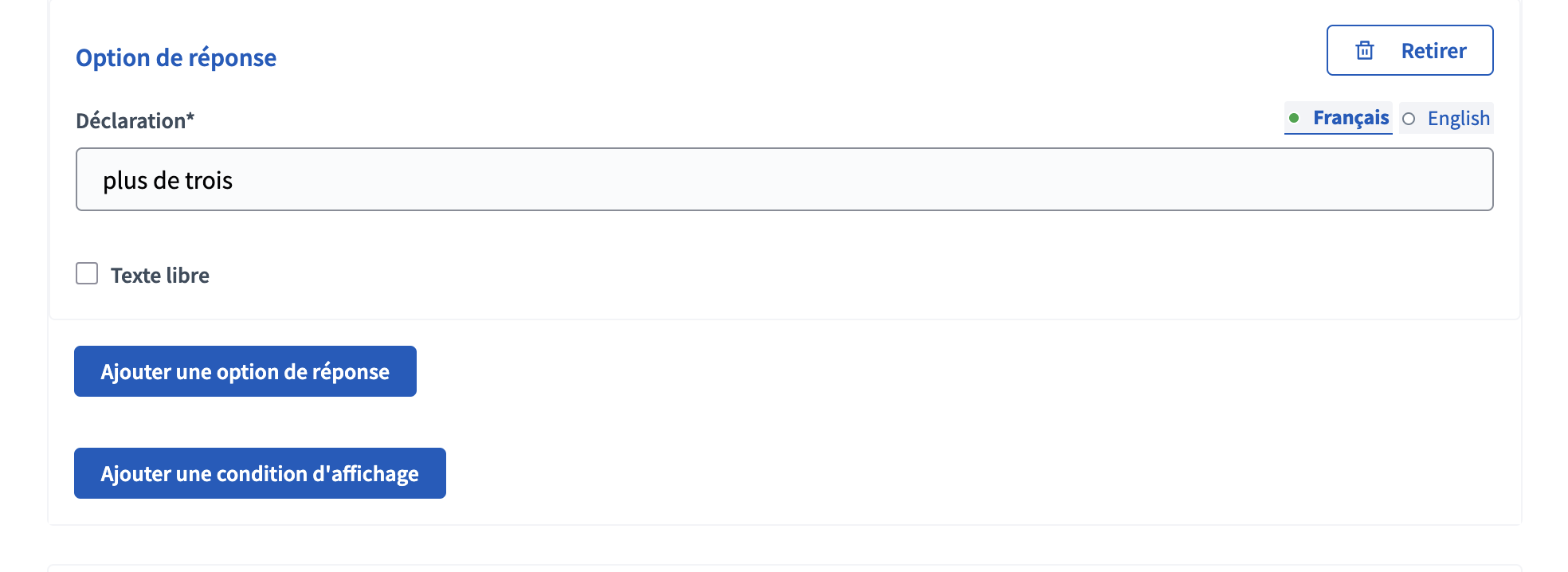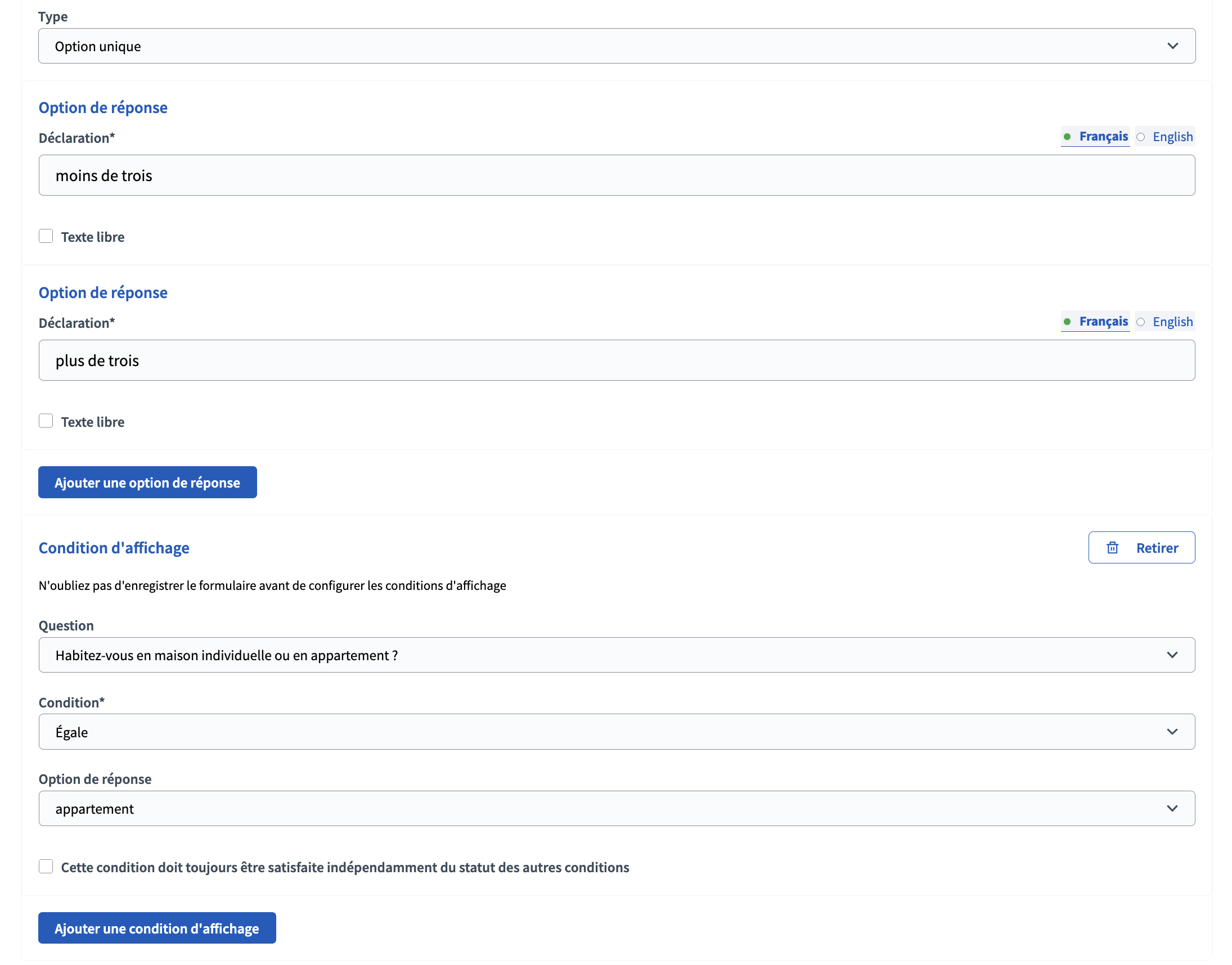 Pour chaque question (à part la toute première), il est possible de définir une ou plusieurs “condition(s) d’affichage” basée(s) sur les réponses précédente de l’utilisateur·ice. A la fin de chaque question est disponible un bouton “condition d’affichage” qui permet de les ajouter.