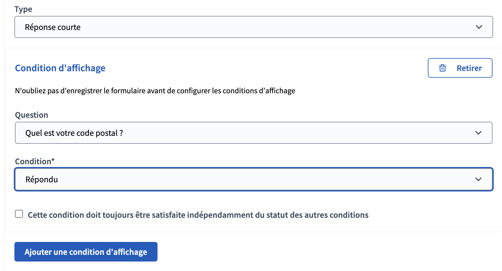- Répondu : si une réponse a été apportée à la question sur laquelle est basée la condition, la question s'affiche.