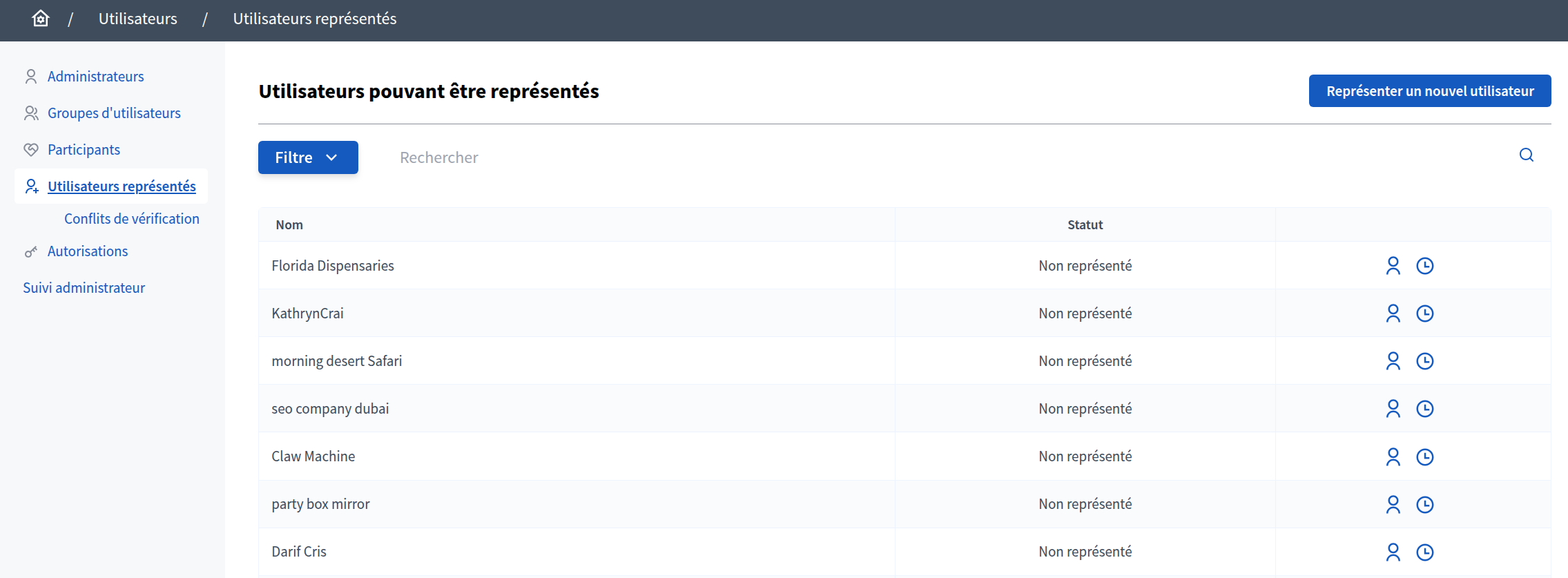Vous accédez à la liste de tous les utilisateur·ices déjà inscrit·es sur la plateforme (statut : “Non représenté”) et de tous les utilisateur·ices représenté·es créé·es, le cas échéant (statut : “Représenté”).