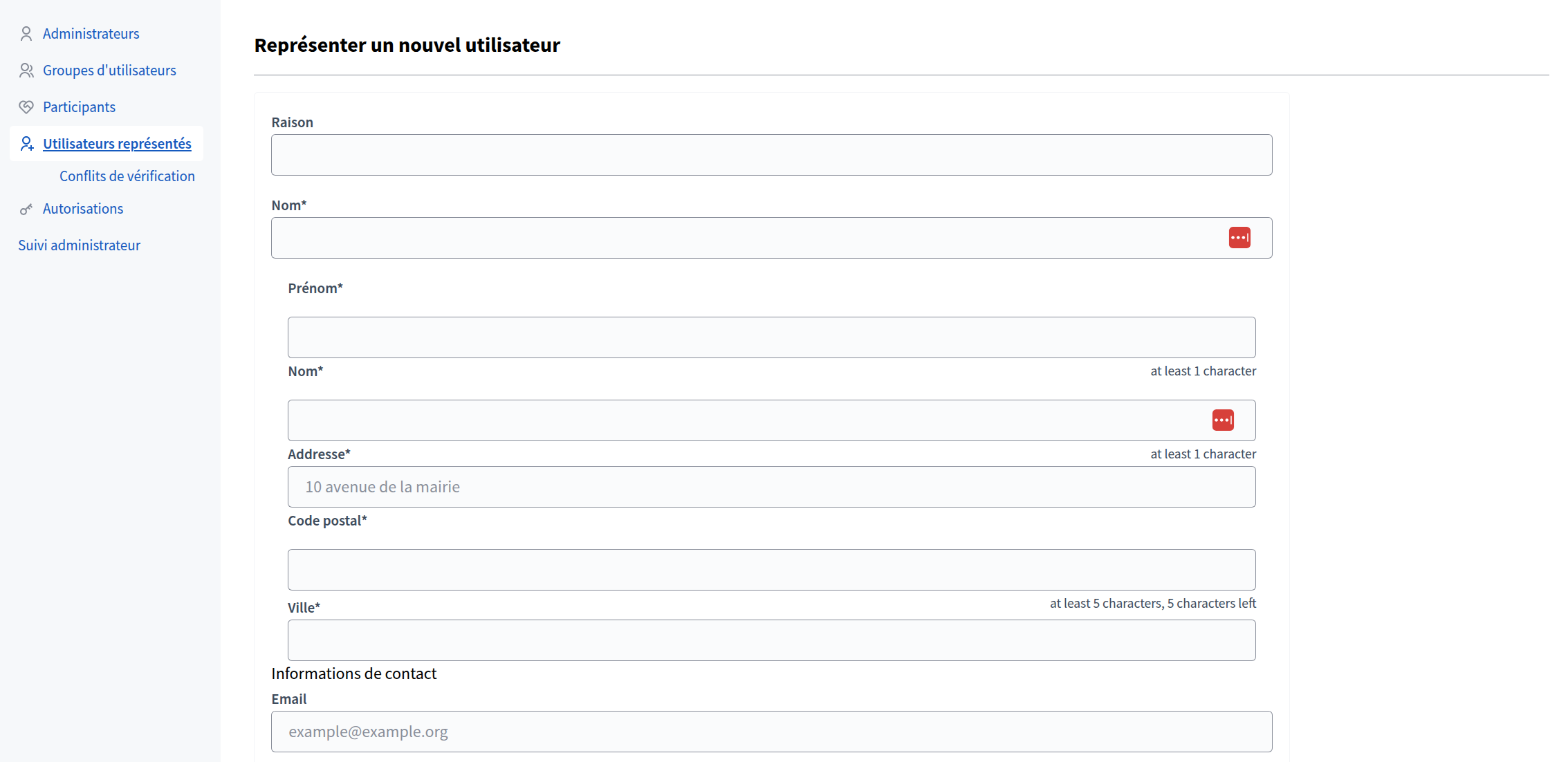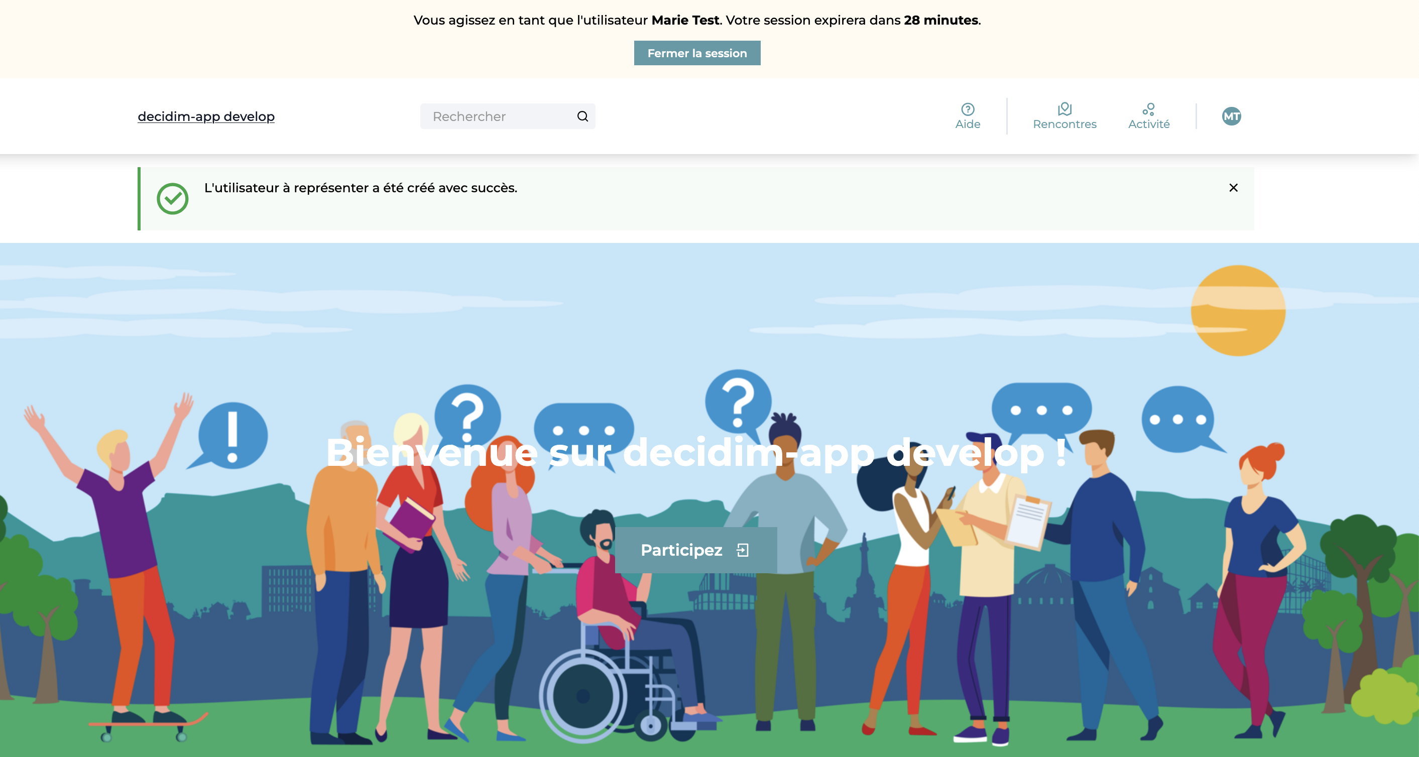 Decidim offre également la possibilité pour un administrateur·ice de représenter un·e utilisateur·ice déjà inscrit·e sur la plateforme.