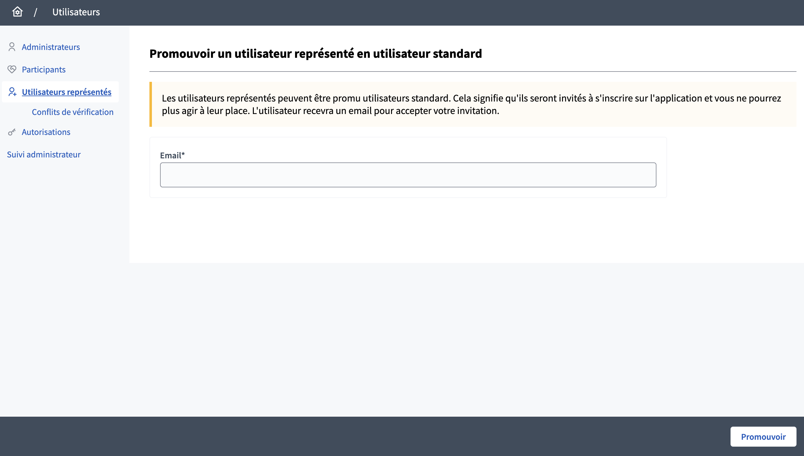 Il est également possible de promouvoir un utilisateur représenté en utilisateur standard - c’est-à -dire qu’il aura un compte normal sur la plateforme. Pour ce faire, cliquez sur l’icône “Fanion”.