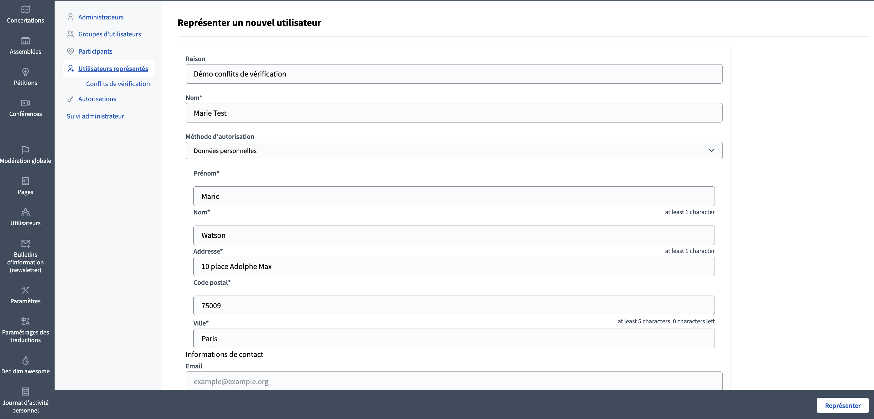 Dans cet exemple, l'administrateur·ice crée un·e nouvel·le utilisateur·ice représenté·e, en lui attribuant un numéro unique. Après avoir cliqué sur le bouton "Représenter", l'administrateur·ice peut agir au nom de l'utilisateur·ice qu'il représente à travers une session dédiée. Une fois les actions effectuées au nom de l'utilisateur·ice, l'administrateur·ice peut fermer la session et revient sur l'espace d'administration.