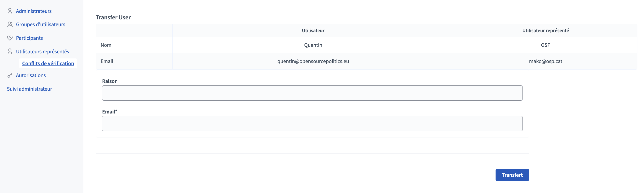 L’administrateur·ice peut alors choisir de transférer l’adresse e-mail du compte créé lors de l’inscription vers le compte de l’utilisateur·ice représenté·e. Après avoir cliqué sur le bouton "Transfert" les adresses e-mails des deux comptes sont automatiquement mises à jour.