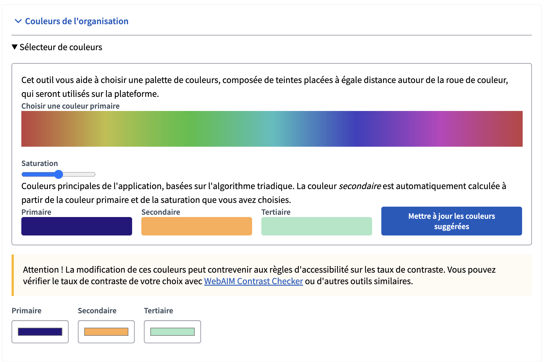 Vous pouvez changer vous-mêmes les couleurs principales de votre plateforme en vous rendant dans Paramètres, puis dans Apparence. Vous aurez accès, tout en bas de la page, à une section contenant les différentes couleurs de votre plateforme (voir ci-dessous).