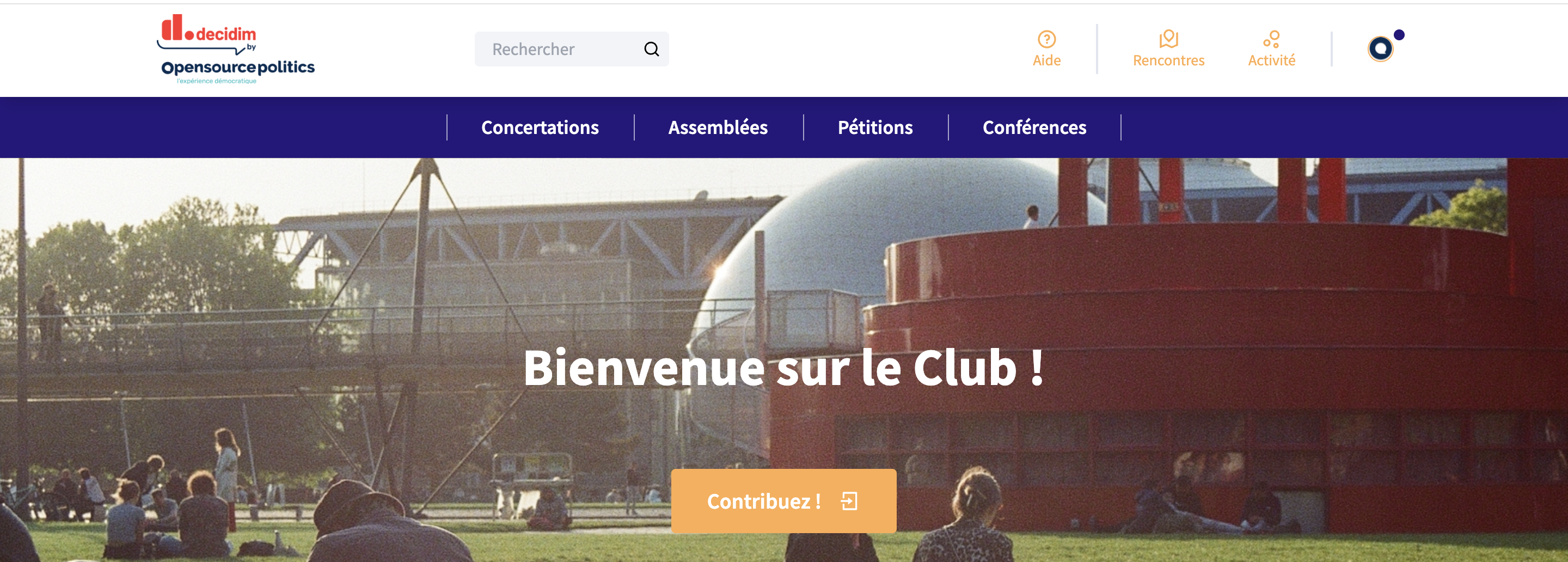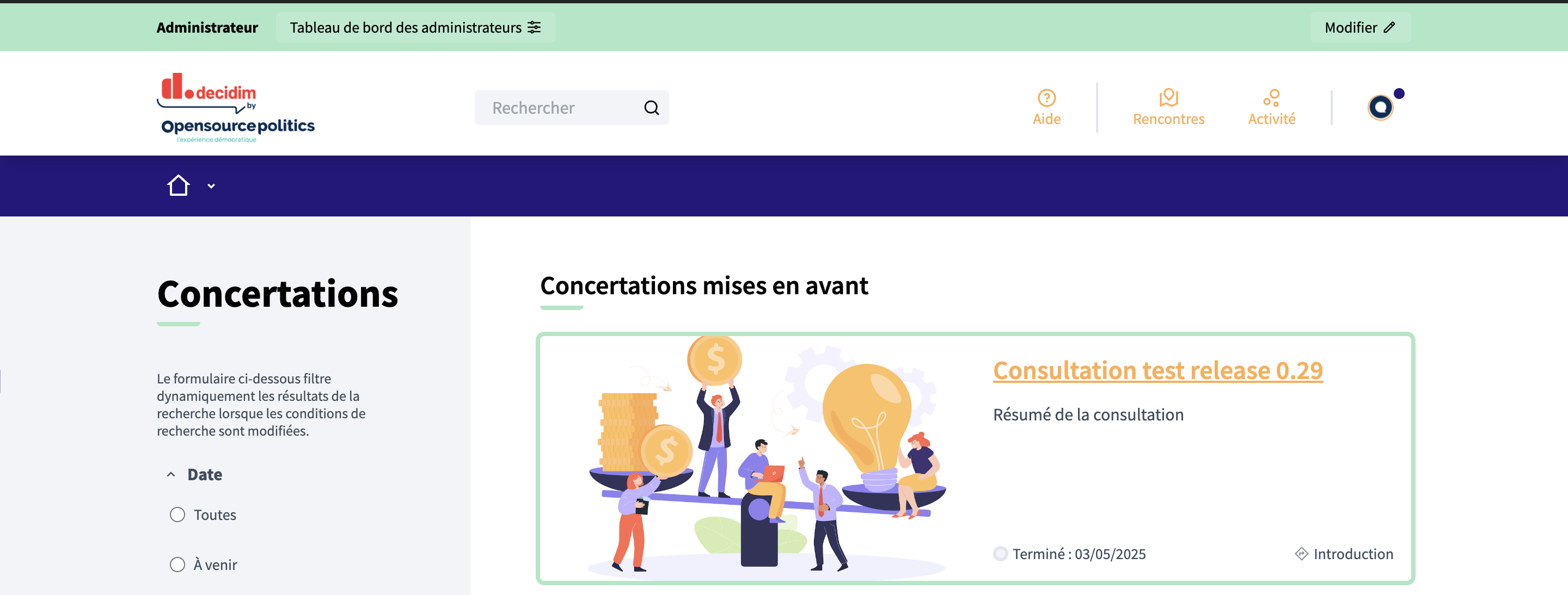 La couleur tertiaire est utilisée dans les métriques, comme calque sur les en-têtes ou encore comme onglet de la barre de navigation des différents espaces. Elle est également utilisée pour accéder au tableau de bord des administrateurs ou modifier des espaces participatifs.