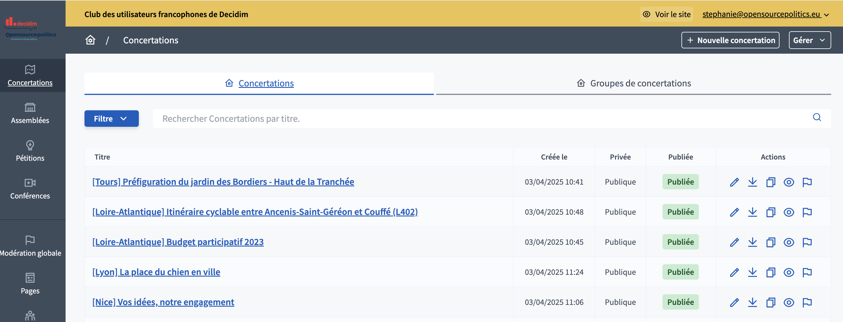 Pour créer un espace participatif, vous devez vous rendre dans le “Tableau de bord des administrateurs”. Dans le menu vertical de gauche, vous cliquez sur “Concertations” ou “Assemblées” selon l’espace souhaité. Vous accédez à la page de gestion des concertations ou des assemblées.