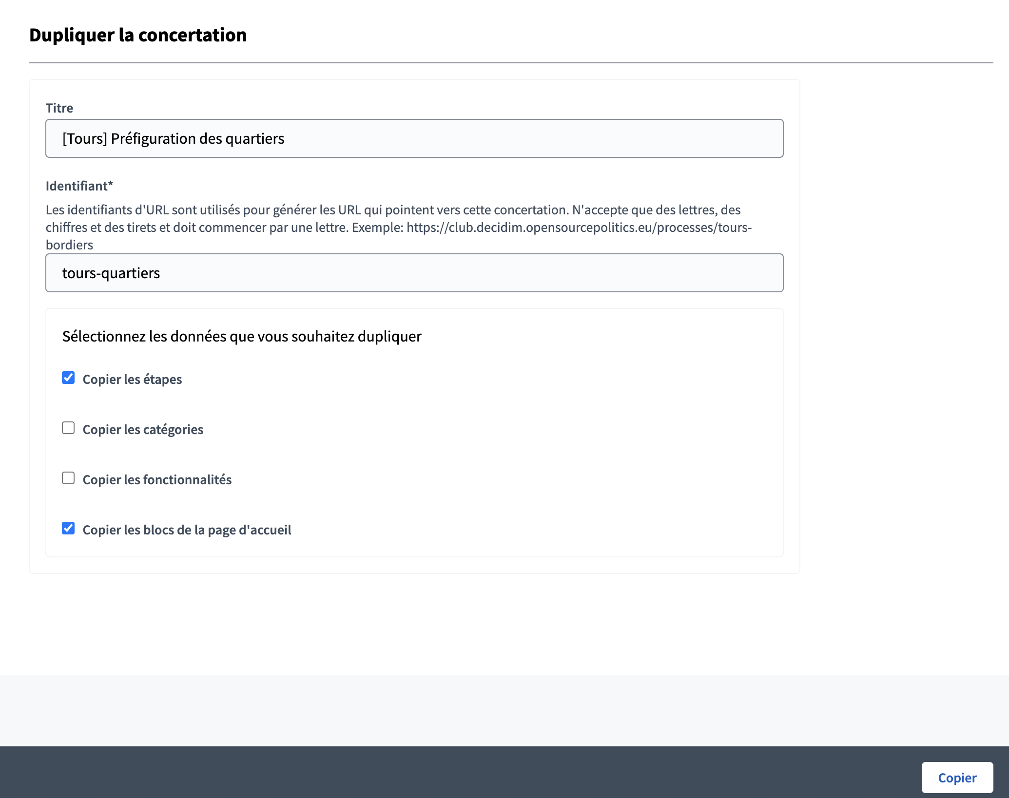 L’espace qui vient d’être créé est alors dupliqué à l’identique avec la configuration de l’espace original (partie "Information"). Changez le titre et l’identifiant pour ne pas confondre l’original et la copie. Vous pouvez également choisir de copier les étapes, les catégories et/ou les fonctionnalités (voir capture ci-dessous). ⚠️ Aucune contribution d’utilisateur·ice n’est reprise dans les fonctionnalités dupliquées. Dupliquer les processus participatifs peut être intéressant si les processus mis en place sont relativement génériques (exemple un budget participatif propre à chaque quartier ou résidence). Il conviendra alors de créer des modèles de configuration génériques duplicables à volonté.
