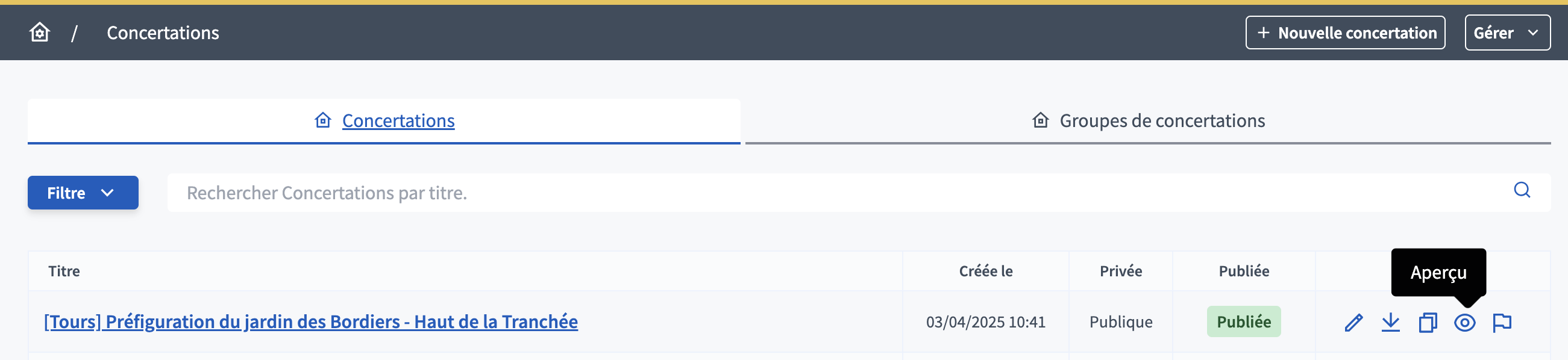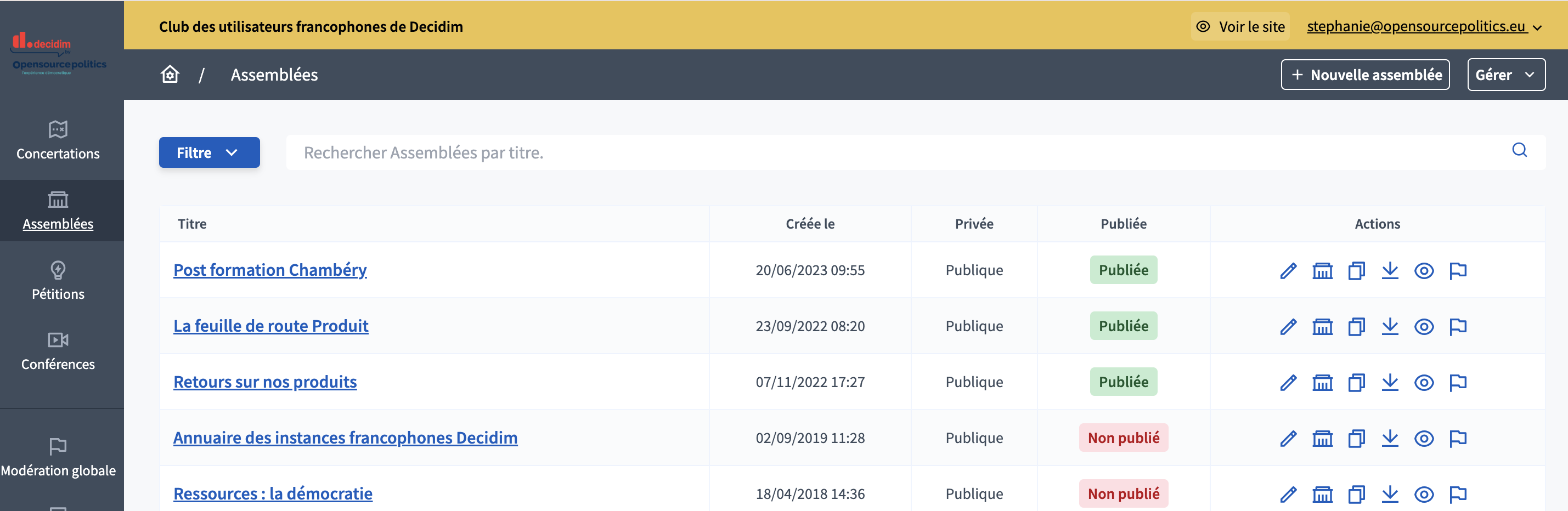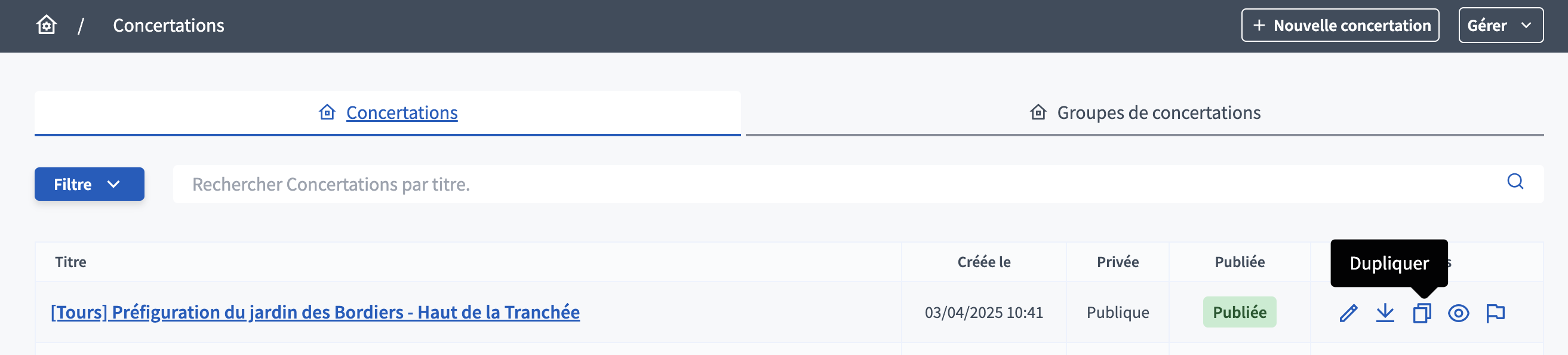 - Pour dupliquer une concertation ou une assemblée existante, cliquez sur l’icône de "Duplication" dans la colonne de droite.
