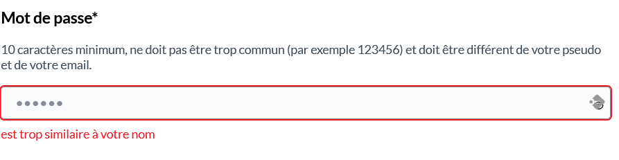 Quand votre mot de passe n'est pas conforme, plusieurs messages d'erreur peuvent s'afficher et vous aider à en trouver la cause: