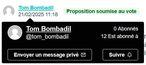 Pour entamer une conversation, il suffit de passer sa souris sur le profil public d'un utilisateur·ice. Pour accéder au profil public d'un utilisateur·ice, cliquez sur son nom ou recherchez le dans la barre de recherche.