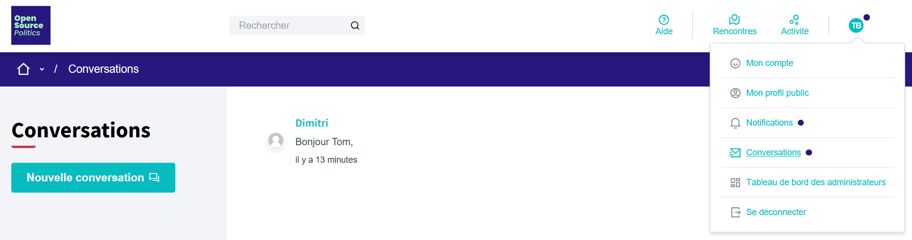 Vous pouvez également contacter des utilisateur·ices en vous rendant dans la partie Conversations de la plateforme