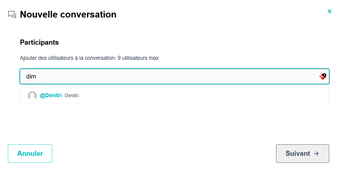 Recherchez le pseudonyme du ou des utilisateur·ices avec qui vous souhaitez échanger, sélectionnez les et cliquez sur "Suivant". Vous pouvez maintenant converser avec ce ou ces utilisateur·ices !