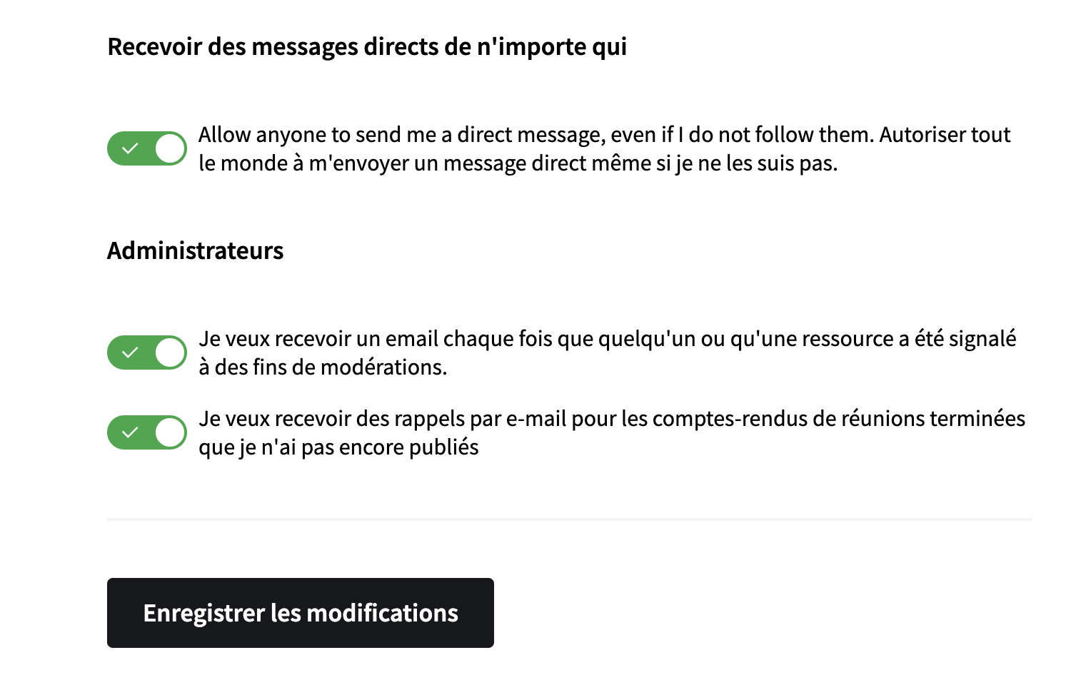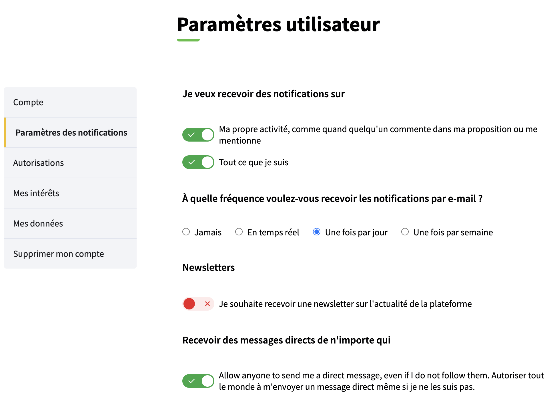 - Fréquence des notifications mail : À partir de la version 0.27, les utilisateur·ices peuvent désormais paramétrer la fréquence à laquelle il·elles souhaitent recevoir leurs notifications par e-mail. Quatre options sont disponibles : en temps réel, une fois par jour, une fois par semaine ou en temps réel.