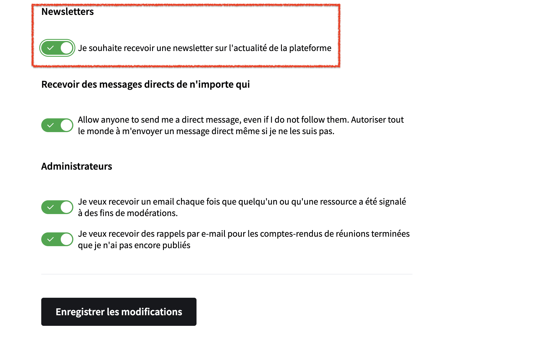 - Activez ou désactivez la réception de la newsletter en cliquant sur le bouton gris/vert