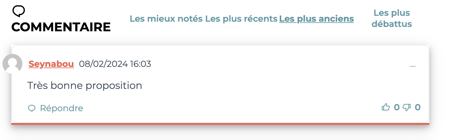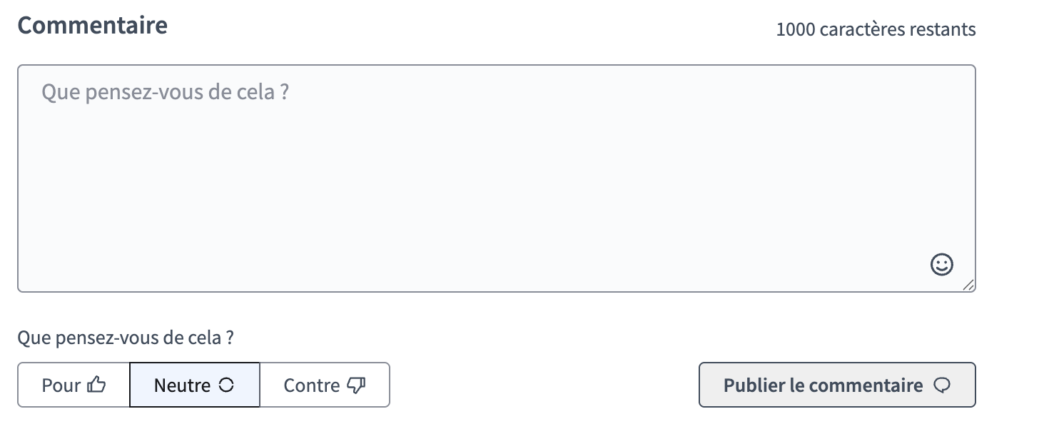Dans les espaces participatifs ou dans les fonctionnalités, les administrateur·ices peuvent activer la possibilité pour les utilisateur·ices de commenter des idées, des débats, des rencontres, ou même des pétitions.
