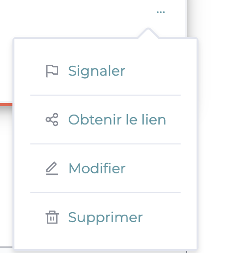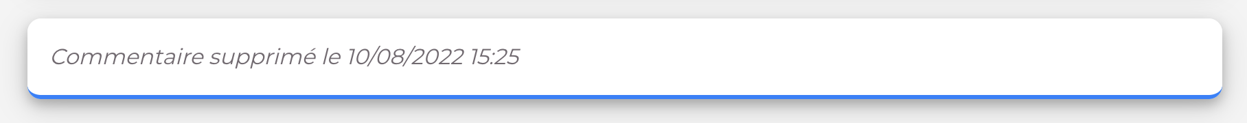 - Supprimer : Le commentaire ne sera plus visible sur la plateforme. Néanmoins, une phrase "Commentaire supprimé le JJ/MM/AAAA HH:MM" sera affichée pour laisser une trace de votre commentaire.