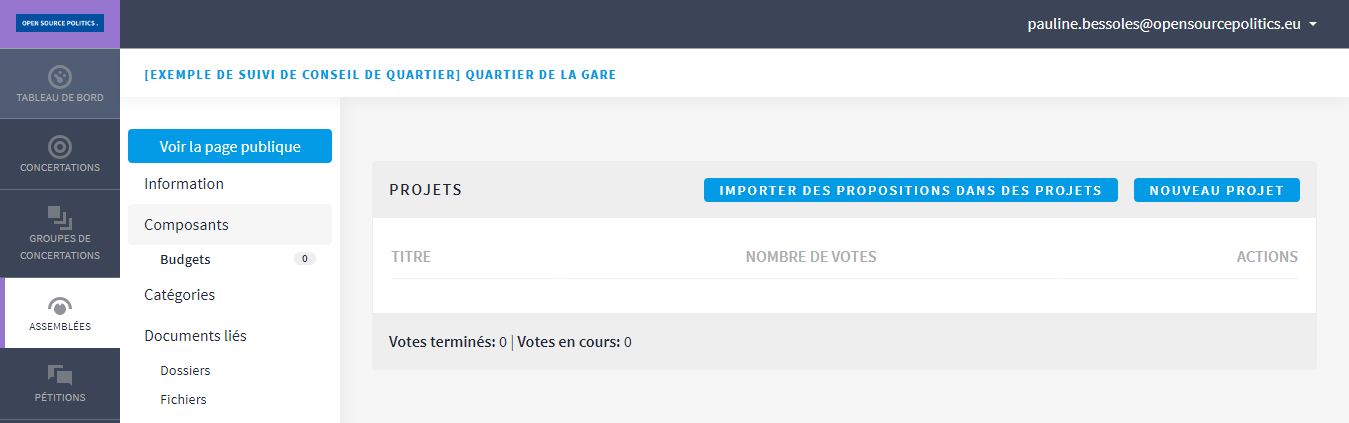 Une fois la fonctionnalité Budgets configurée, les projets qui seront soumis au vote doivent être créés. Rendez-vous dans le sous-menu de votre espace participatif, à l'onglet "Fonctionnalités" ou "Composants" et cliquez sur la fonctionnalité Budgets nouvellement créée.