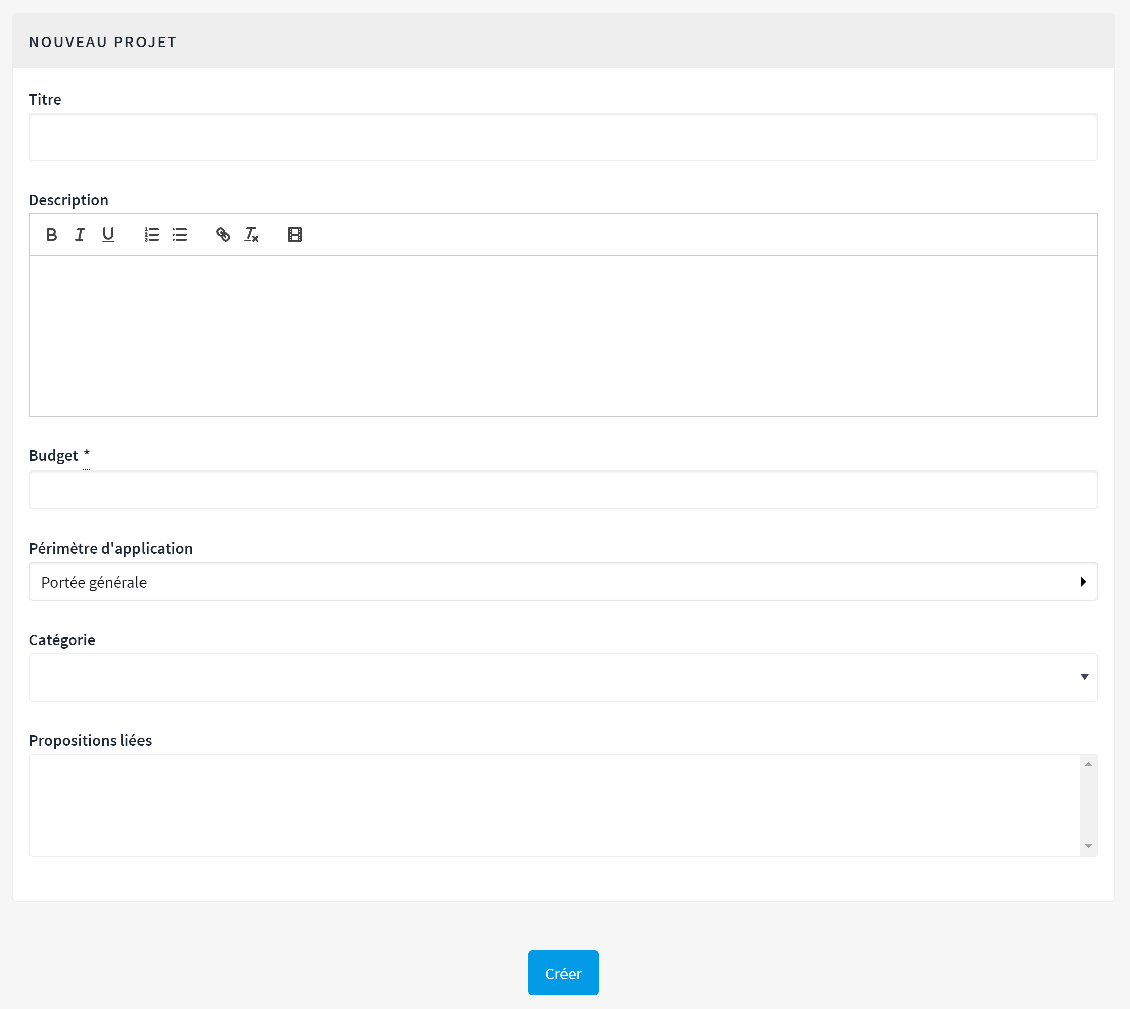 Si vous le souhaitez, vous pouvez importer des propositions issues du même espace participatif en cliquant sur "Importer des propositions dans des projets". Pour créer un nouveau projet, appuyez sur "Nouveau projet". La fenêtre de création d'un nouveau projet permet d'éditer différents champs :